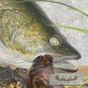 The walleye is a large freshwater game fish found in large lakes and rivers in the northern United States and Canada. It gets its name from its bulbous eyes, which protrude outward from the side of its head. The walleye is popular among anglers for its size, fight, and delicious meat, and is most commonly fished for at dawn, dusk, or during choppy waved weather, when the walleye tend most often to feed. The walleye can grow upwards near 3 feet in length and is typically gold, grey-green and light brown in color.