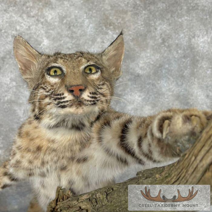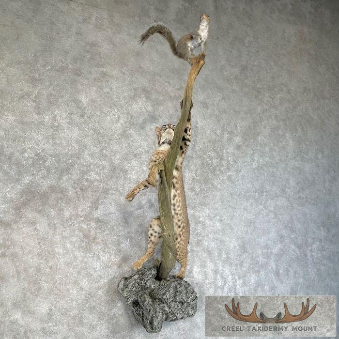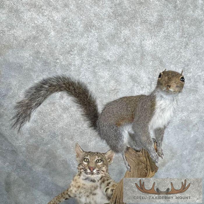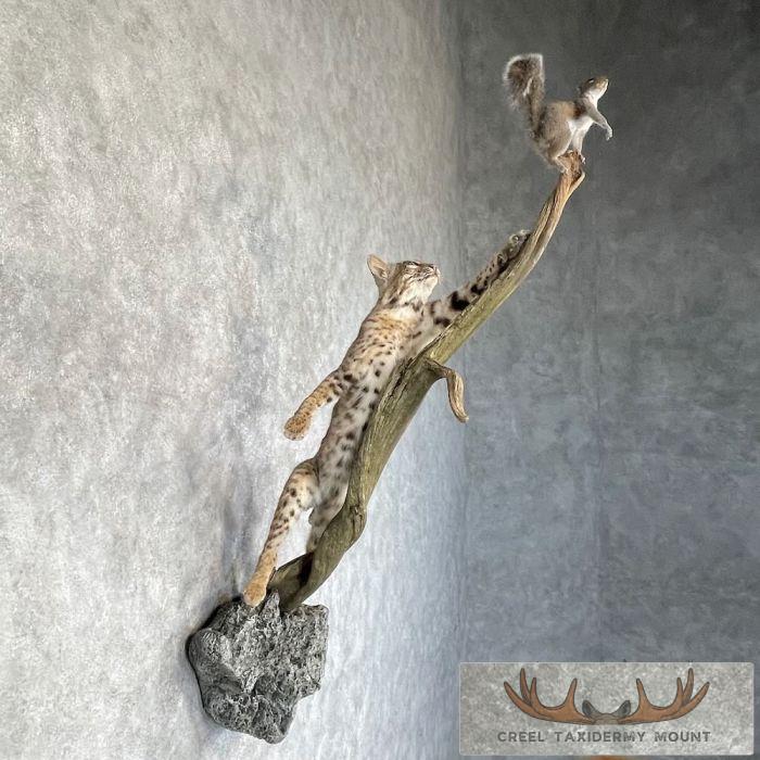 For sale, we have a first-rate Bobcat life-size taxidermy mount, posed reaching for a Grey Squirrel. The Bobcat features soft fur, a professionally tanned hide, and expert taxidermy craftsmanship. The squirrel is also outstanding, featuring a terrific hide and masterful taxidermy craftsmanship. Both mounts are affixed on a custom-made faux rock wall base with a driftwood branch. All applicable measurements and dimensions are provided to help ensure this item will fit within your intended space, as well as meet expectations regarding the item’s featured attribute sizes, scores, etc.