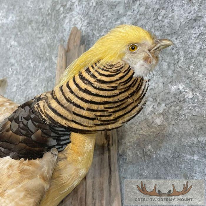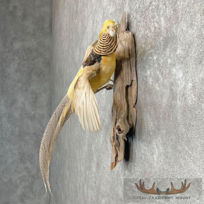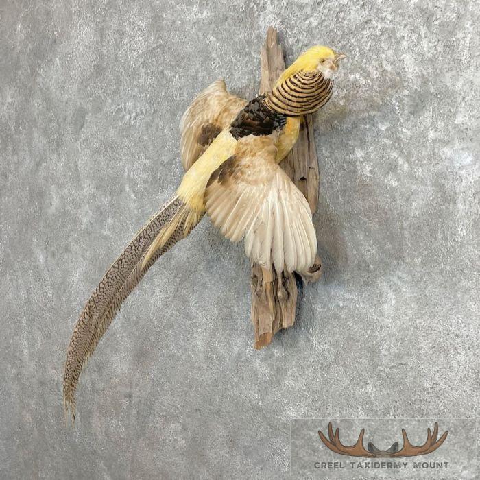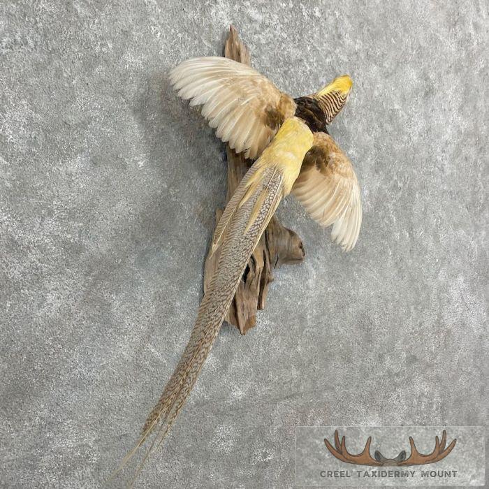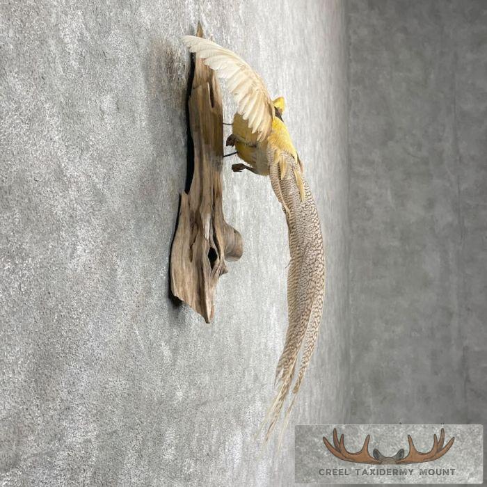 For sale, we have a beautiful Buff Golden Pheasant taxidermy bird mount, posed flying to the viewer’s right side across a piece of driftwood. The flying pose helps show off the amazing colors and plumage to the room. All of this combined with phenomenal taxidermy craftsmanship earns this item our Premier+™ overall quality rating. All applicable dimensions are included to help ensure this item will fit within your intended display space.