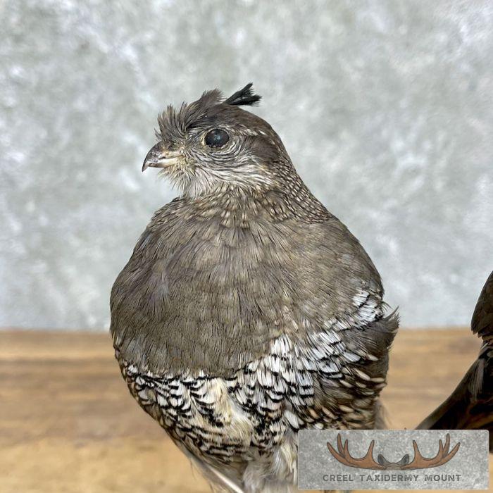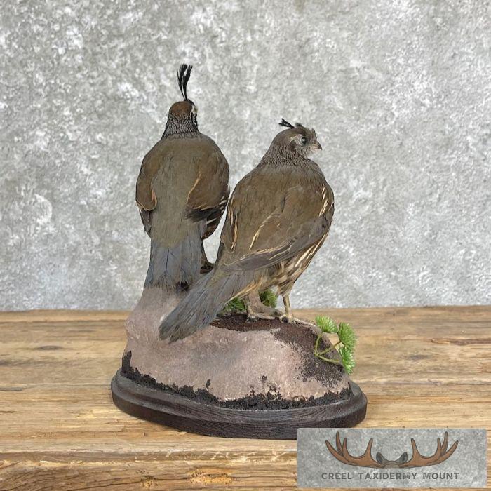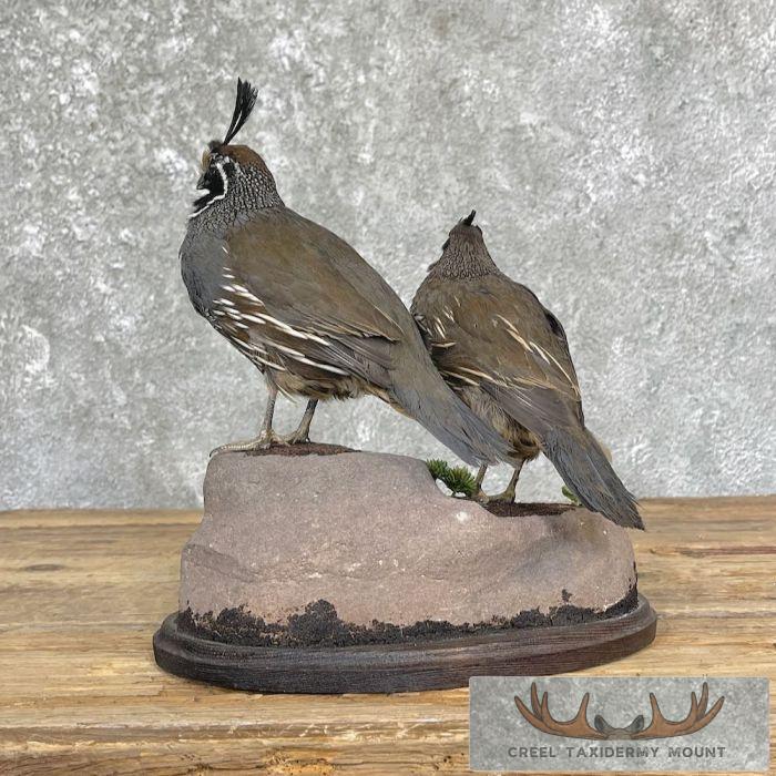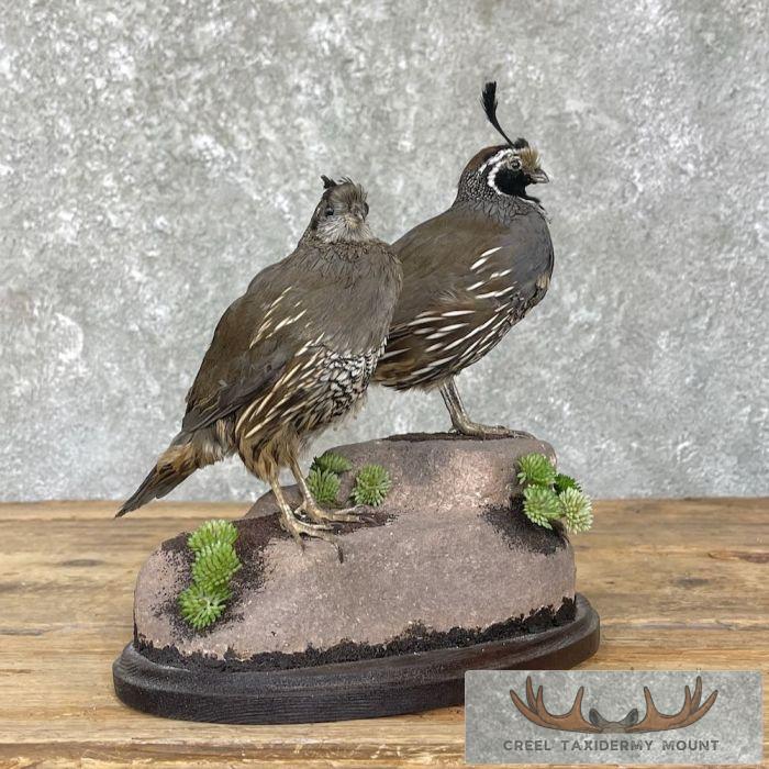 For sale, we have a first-rate California Quail Pair taxidermy bird mount, posed standing on a faux rock base. Both quail feature good plumage, nice coloration, and excellent taxidermy craftsmanship. All applicable measurements and dimensions are provided to help ensure this item will fit within your intended space, as well as meet expectations regarding the item’s featured attribute sizes, scores, etc.