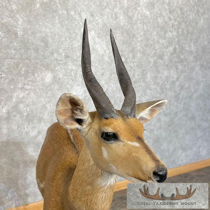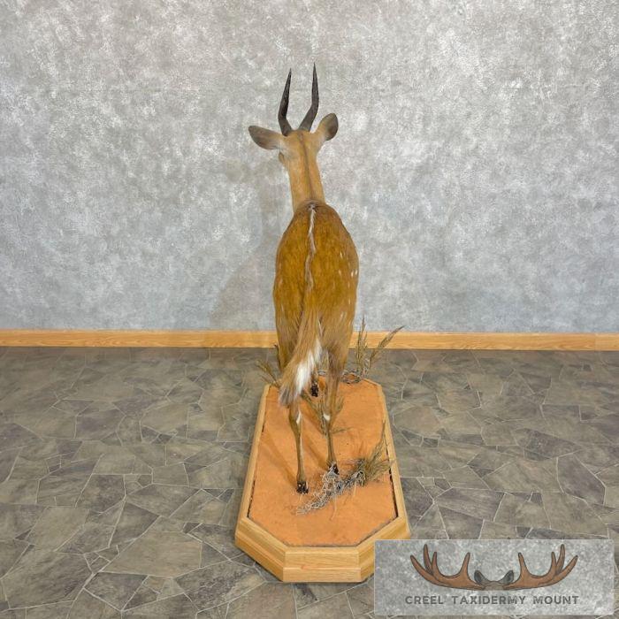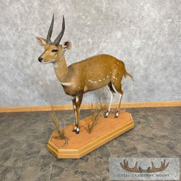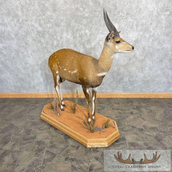 For sale, we have an amazing Cape Bushbuck life-size taxidermy mount, posed standing on a habitat base. The Bushbuck itself features great chestnut-colored hair, a professionally tanned hide, phenomenal taxidermy craftsmanship, and a large set of horns that earn a Safari Club International Silver Medal with a score of 35 0/8″. The habitat base is perfect as it is simple and will not take away from the Bushbuck. All applicable measurements and dimensions are provided in the specifications section to help ensure this item will fit within your intended space, as well as meet expectations regarding the item’s featured attribute sizes, scores, etc.