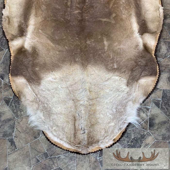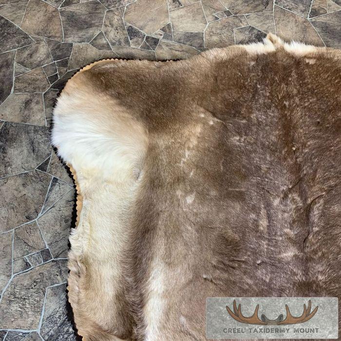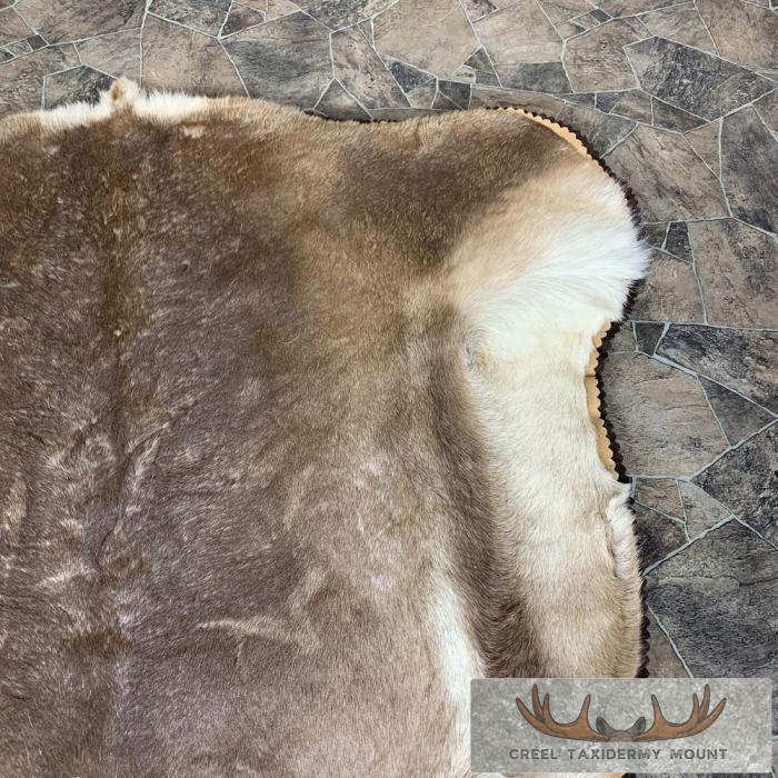 For sale, we have a Caribou taxidermy rug. Typically a caribou is not an animal that you see as a rug. This beautiful rug features fantastic hair, canvas backing, and black and tan felt accent border. This rug is best displayed on the floor, but there should be no foot traffic as it will ruin the hair. All applicable measurements and dimensions are provided in the specifications section to help ensure this item will fit within your intended space, as well as meet expectations regarding the item’s featured attribute sizes, scores, etc.