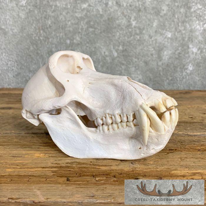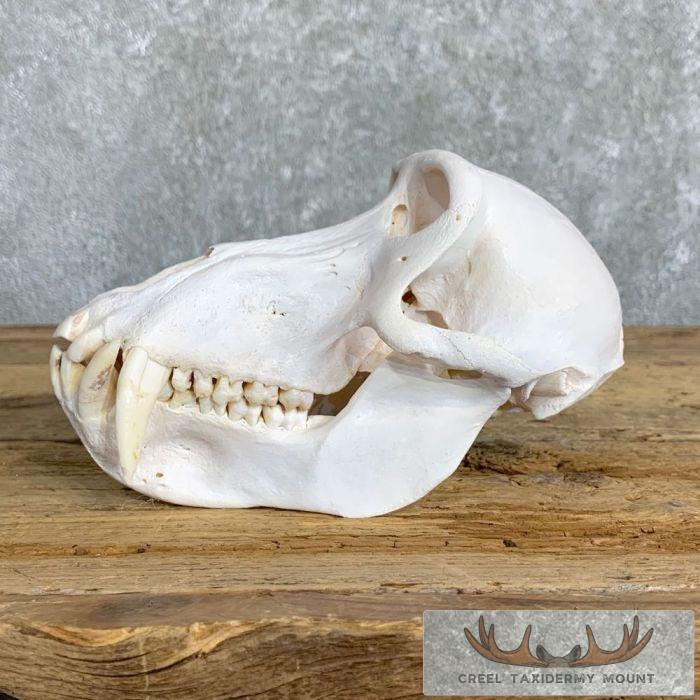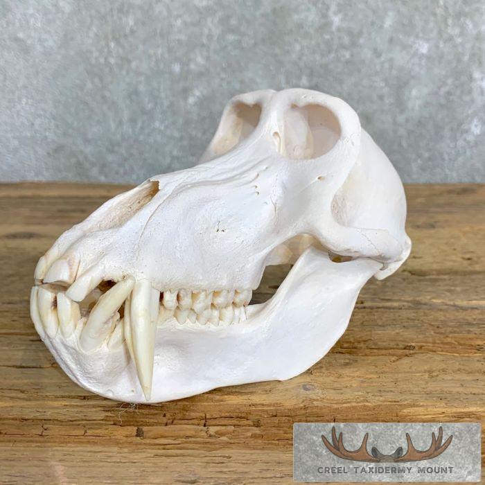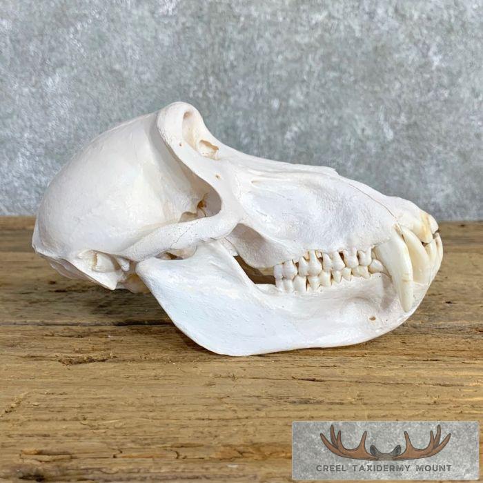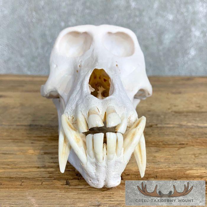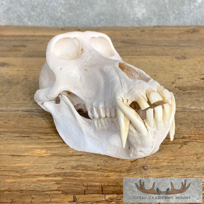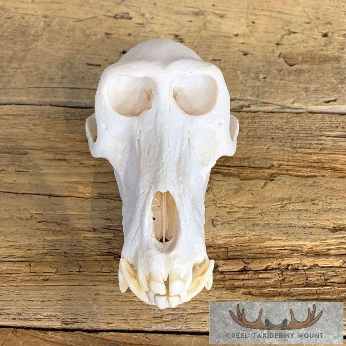 For sale, we have an outstanding Chacma Baboon full skull mount. The skull itself has been professionally cleaned and whitened. This is no small Chacma Baboon skull with measurements of 4 3/16″ in width and 7 8/16″ in length. The teeth on this beast of massive also, measuring 1 9/16″ and 1 11/16″ on the top and 1 6/16″ and 1 4/16″ on the bottom. All applicable measurements and dimensions are provided in the specifications section to help ensure this item will fit within your intended space, as well as meet expectations regarding the item’s featured attribute sizes, scores, etc.