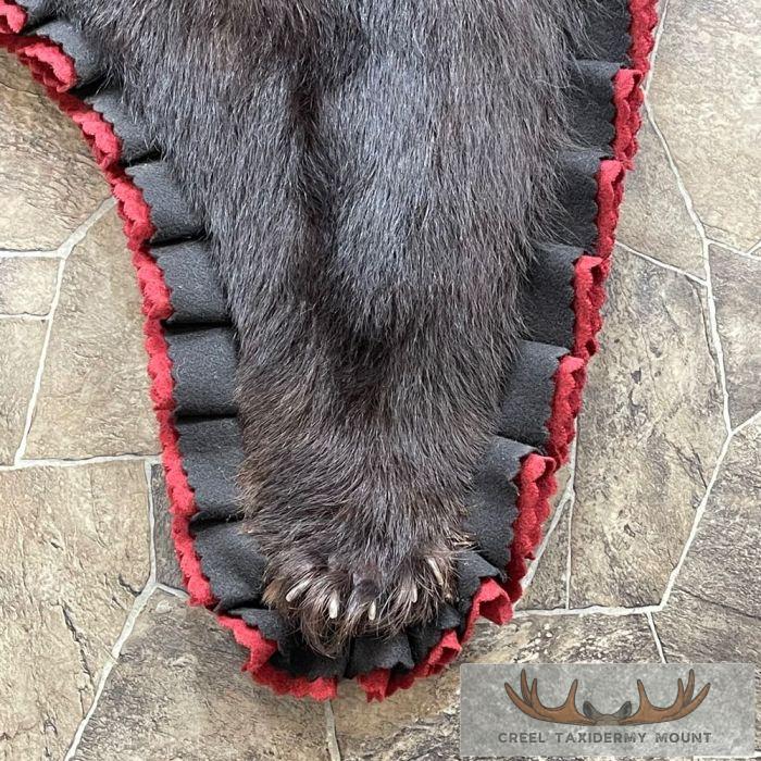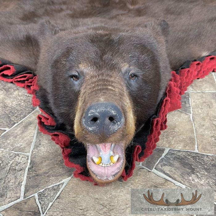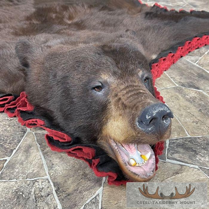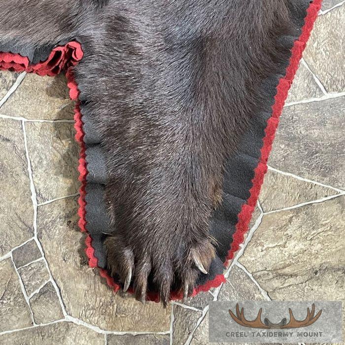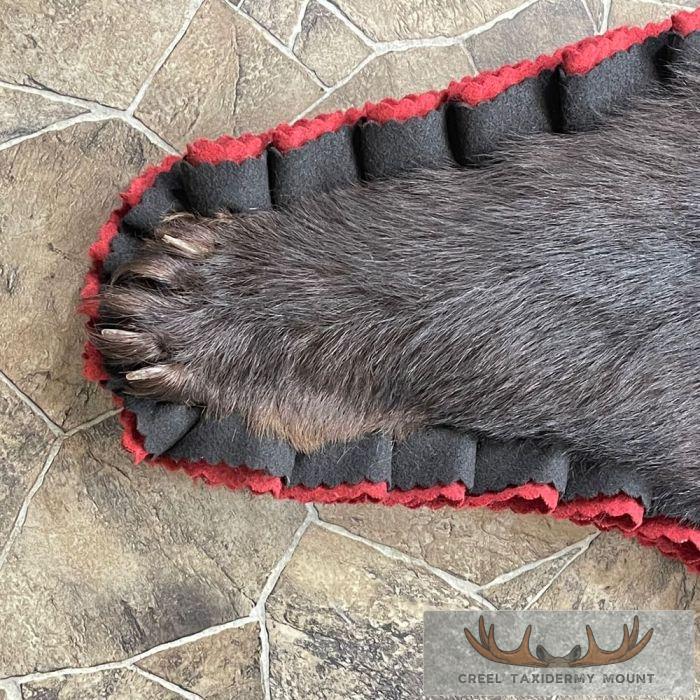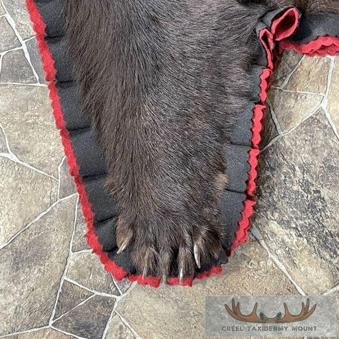 For sale, we have a magnificent North American Black Bear full-size taxidermy rug mount. This rug features a raised head, an open mouth, a unique chocolate coloration, a black fabric backing that provides durability and protection against wear, and is finished with a beautiful red and black furled felt accent trim. Black Bear rugs have been prominent in North American decor for ages, so now is your chance to be part of this time-honored tradition. The Black Bear rug is best displayed on the floor, but foot traffic is not recommended, as it will damage the hair. All applicable measurements and dimensions are provided in the specifications section to help ensure this item will fit within your intended space, as well as meet expectations regarding the item’s featured attribute sizes, scores, etc.
