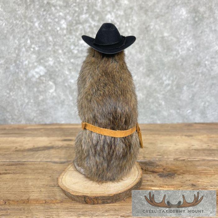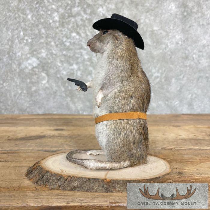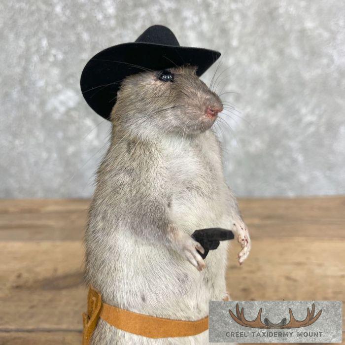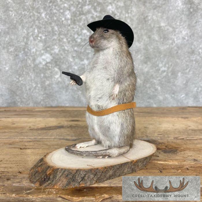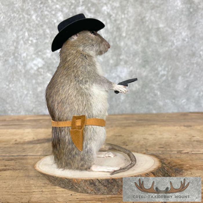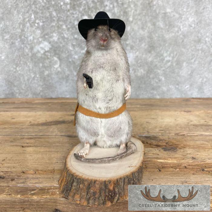 For sale, we have a dazzling Cowboy Rat taxidermy mount, posed standing on a tree cookie base. This Cowboy has on a nice black cowboy hat and a leather holster to hold his six-shooter. The Rat itself features good hair, a nice hide, and exceptional taxidermy craftsmanship. If you are looking for a special Rat mount, then this is the one for you! All applicable measurements and dimensions are provided in the specifications section to help ensure this item will fit within your intended space, as well as meet expectations regarding the item’s featured attribute sizes, scores, etc.