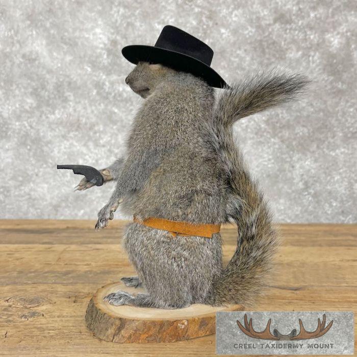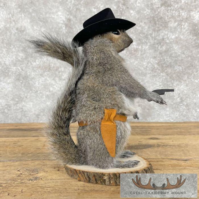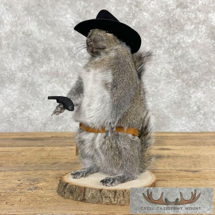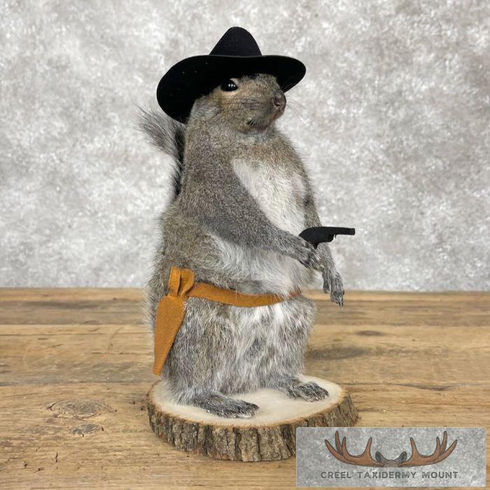 For sale, we have a fabulous novelty ‘Cowboy’ Grey Squirrel taxidermy mount. This squirrel is posed with a cowboy hat, leather holster, and a mini revolver. The terrific fur and top-notch taxidermy craftsmanship combine to create an exceptional novelty mount. All applicable dimensions are included to help ensure this item will fit within your intended display space.