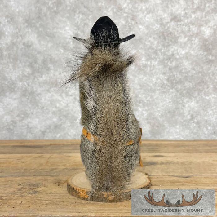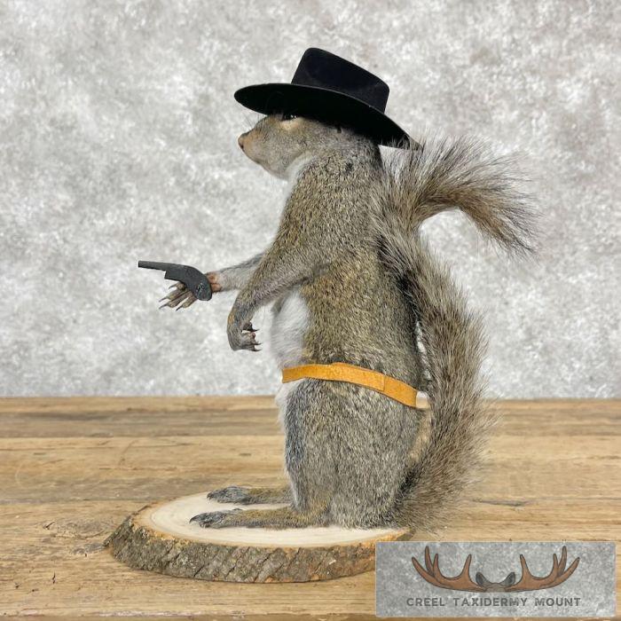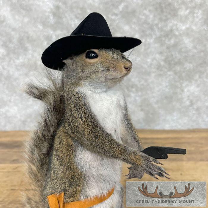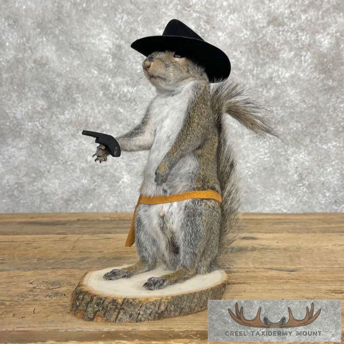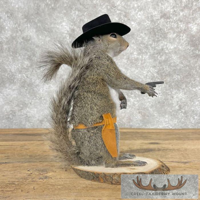 For sale, we have an exceptional novelty ‘Cowboy’ Grey Squirrel taxidermy mount. This squirrel is posed with a cowboy hat, leather holster, and a mini revolver. The terrific fur and top-notch taxidermy craftsmanship combine to create an exceptional novelty mount. All applicable dimensions are included to help ensure this item will fit within your intended display space.