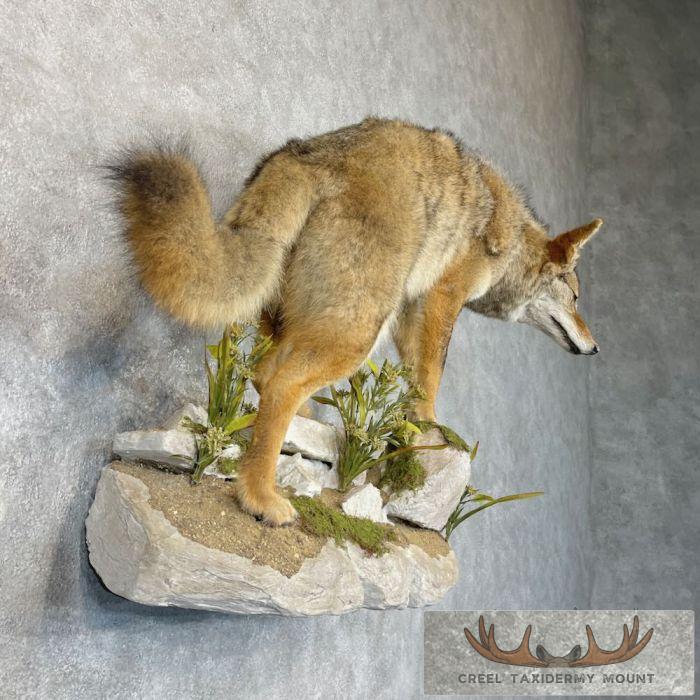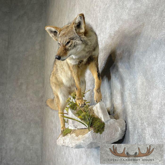 For sale, we have an exceptional life-size Coyote taxidermy mount, posed walking on a custom faux rock wall base. The custom base also features faux vegetation and moss accents, which adds to the overall realism of the piece. The Coyote itself features a thick, soft hide and has been professionally cleaned to ensure it will last a lifetime. All applicable measurements and dimensions are provided in the specifications section to help ensure this item will fit within your intended space, as well as meet expectations regarding the item’s featured attribute sizes, scores, etc.