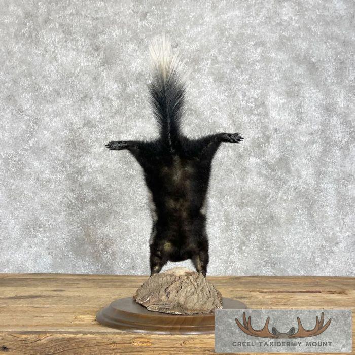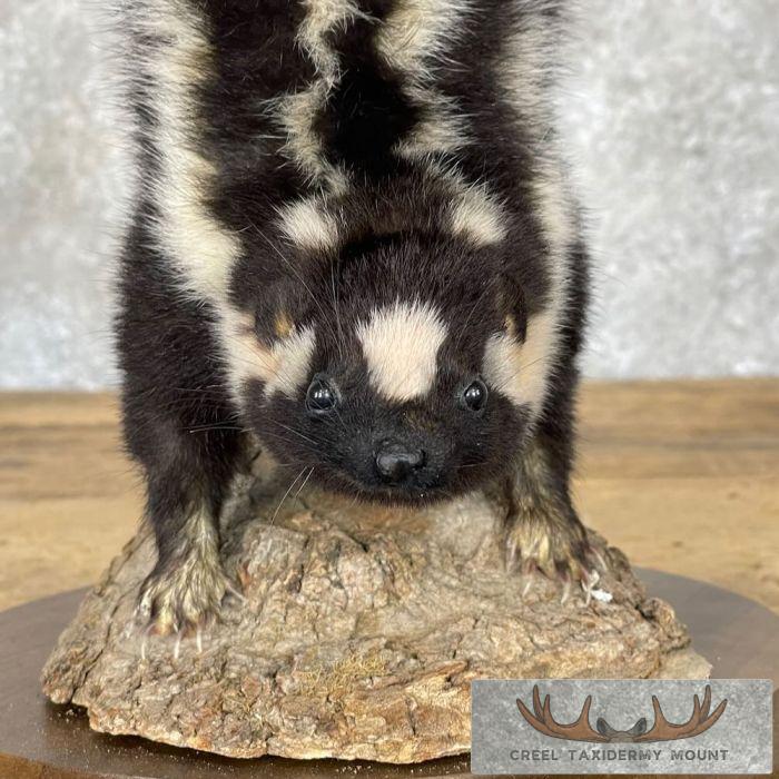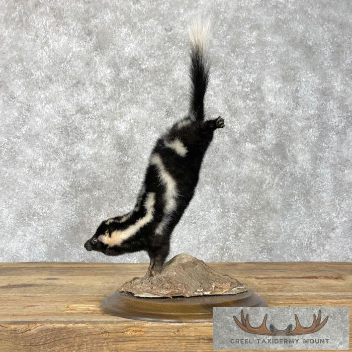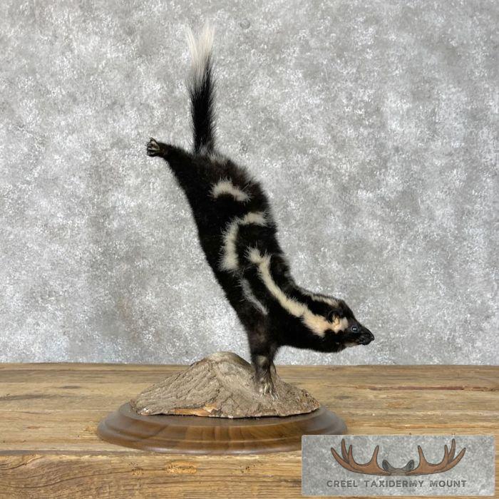 For sale, we have a magnificent Eastern Spotted Skunk life-size taxidermy mount on a wood base. It is posed standing on its front legs with its back legs in the air. Eastern Spotted Skunks do this when they feel threatened. This skunk has gorgeous, soft hair (no odor!) and skillful craftsmanship, earning our Premier™ overall quality rating. All applicable dimensions are included to help ensure this item will fit within your intended display space.