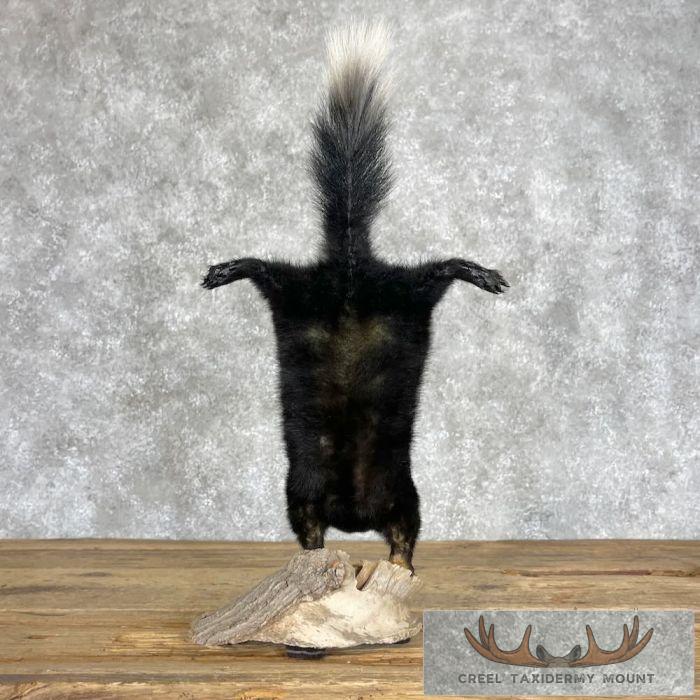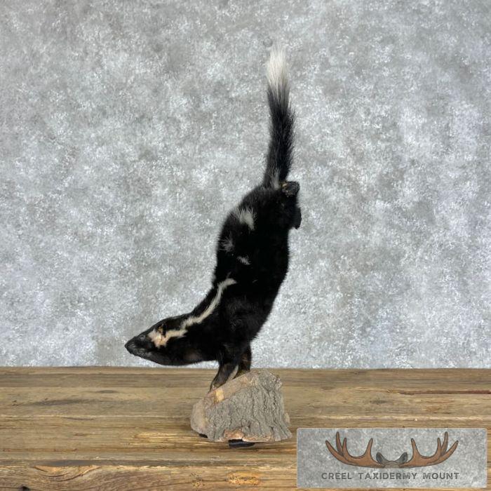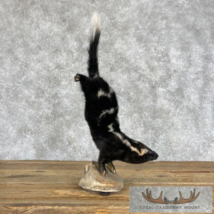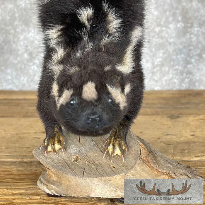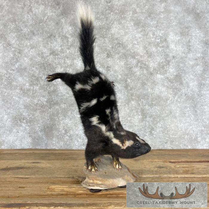 For sale, we have a beautiful Eastern Spotted Skunk life-size taxidermy mount on a small log. It is posed standing on its front legs with its back legs in the air. Eastern Spotted Skunks do this when they feel threatened. This skunk has beautiful, soft hair (no odor!) and terrific craftsmanship, earning our Excellent™ overall quality rating. All applicable dimensions are included to help ensure this item will fit within your intended display space.