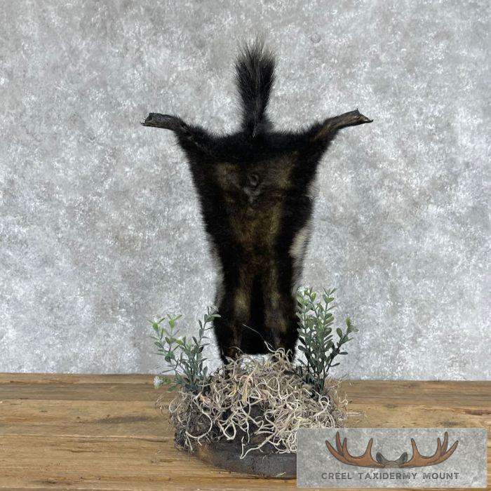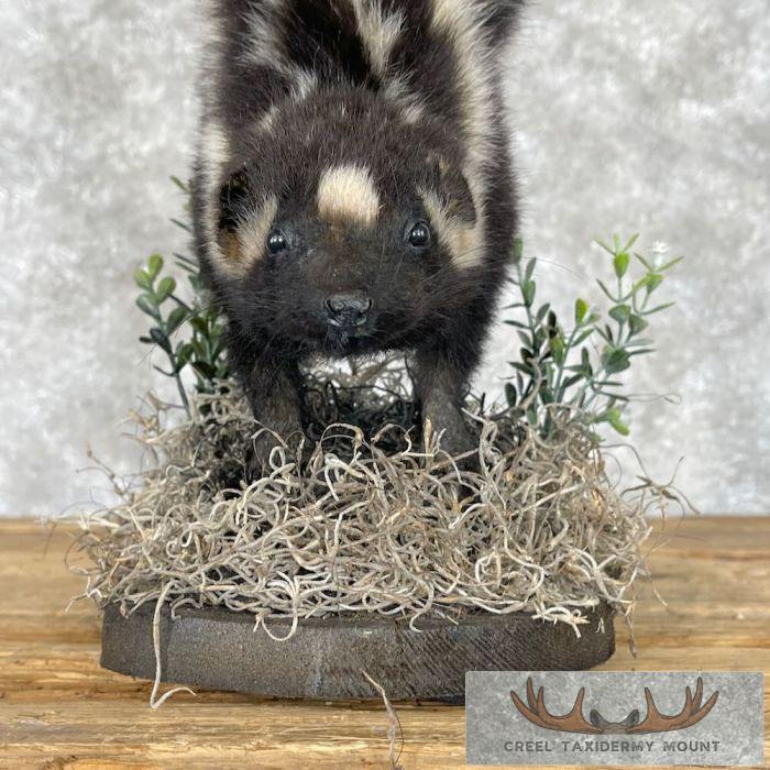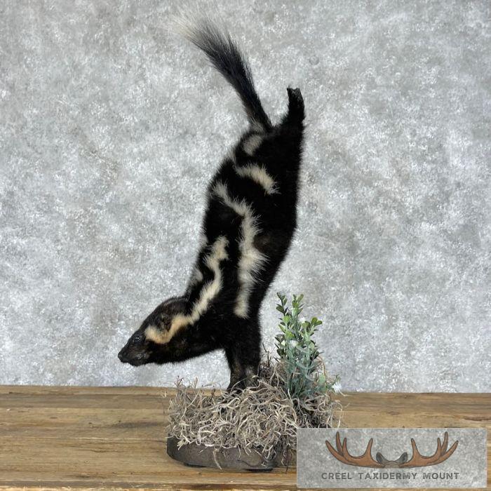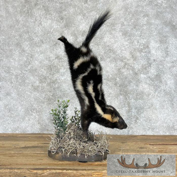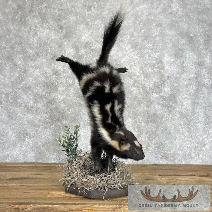 For sale, we have a stunning Eastern Spotted Skunk life-size taxidermy mount on a habitat base. It is posed standing on its front legs with its back legs in the air. Eastern Spotted Skunks do this when they feel threatened. This skunk has beautiful, soft hair (no odor!) and terrific craftsmanship, earning our Excellent™ overall quality rating. All applicable dimensions are included to help ensure this item will fit within your intended display space.