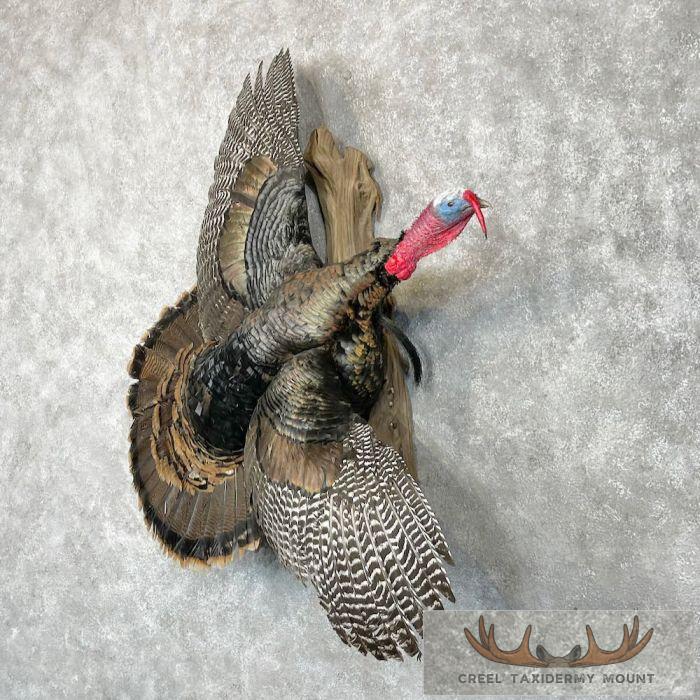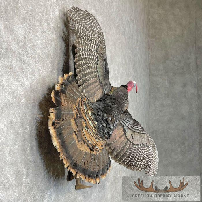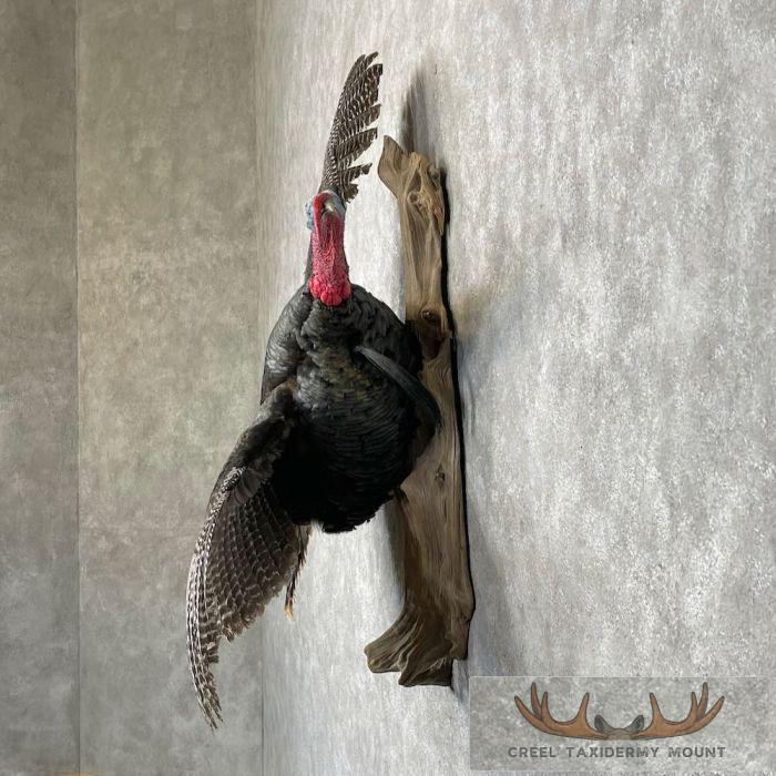 For sale, we have a first-rate Eastern Turkey life-size taxidermy mount, posed flying to the viewer’s right side. The flying mount gives the viewer a beautiful view of the feathers and fan, making it one of the most desirable positions. All of this combines with expert taxidermy craftsmanship to earn this mount our Excellent™ overall quality rating. All applicable sizes and dimensions are included to ensure this item fits within your intended space.