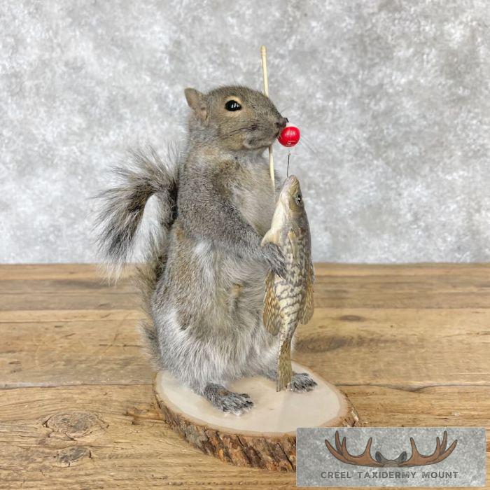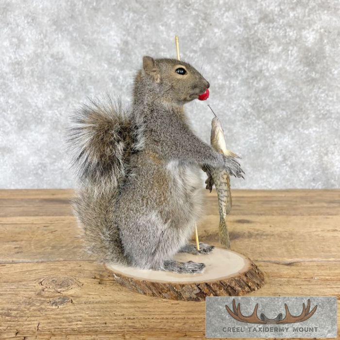 For sale, we have a magnificent Fishing Grey Squirrel novelty taxidermy mount, posed standing on a tree cookie base, holding a little fishing pole with a fresh catch. The outstanding fur and top-notch taxidermy craftsmanship combine to earn this item our Premier™ overall quality rating. All applicable dimensions are included to help ensure this item will fit within your intended display space.