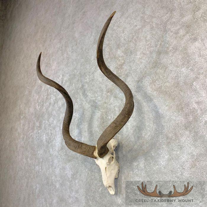 This is a fantastic Kudu skull and horns “European-style” taxidermy mount, featuring a great skull and a massive set of horns. These massive horns have lengths of 59 5/8″ and 57 4/8″ which helps it achieve an SCI Gold Medal with a score of 138 3/8″. The skull was professionally cleaned and whitened. All this combined with top-quality taxidermy craftsmanship earns this item our Premier Plus™ overall quality rating. All applicable dimensions are included to help ensure this item will fit within your intended display space.