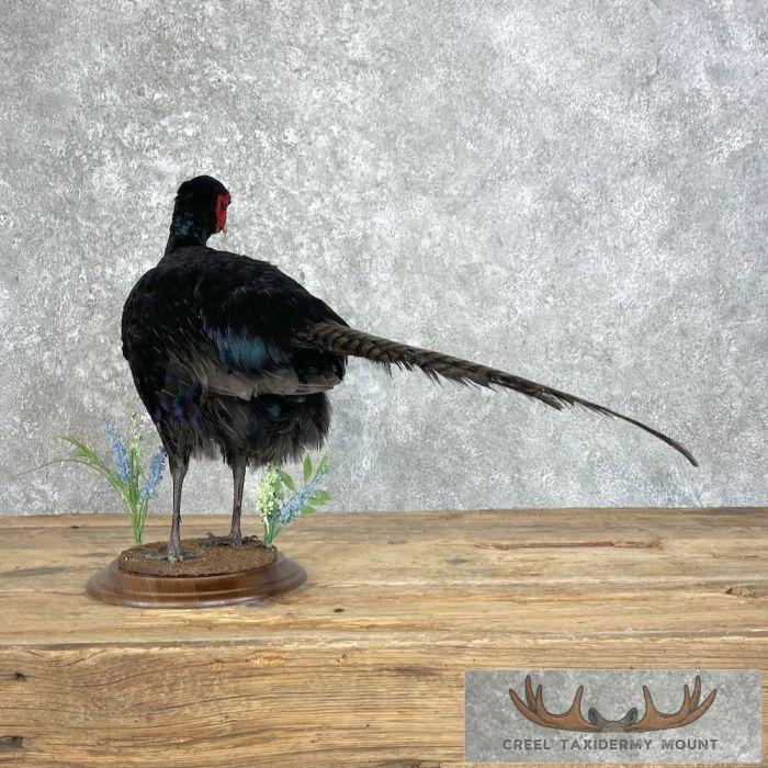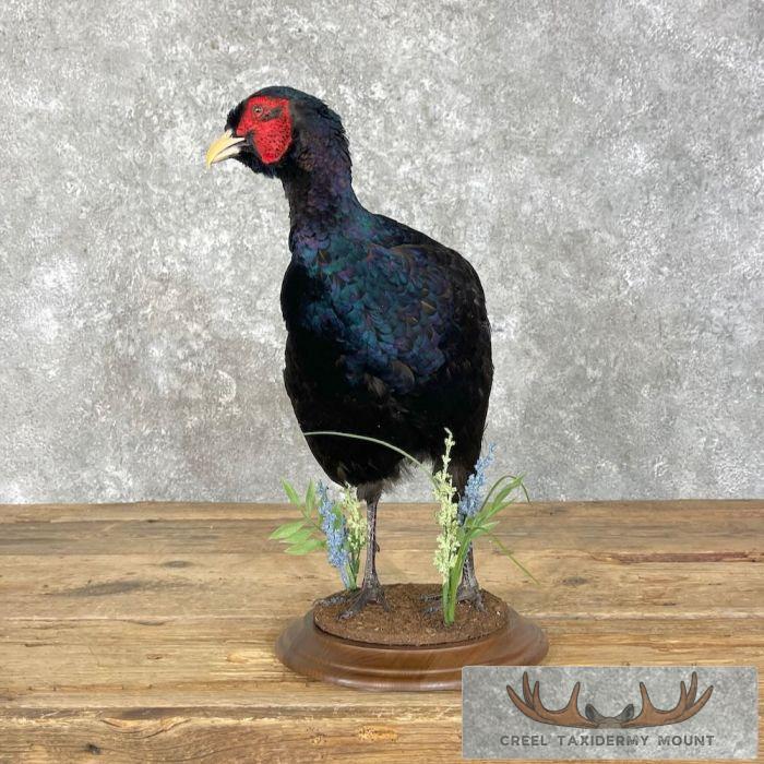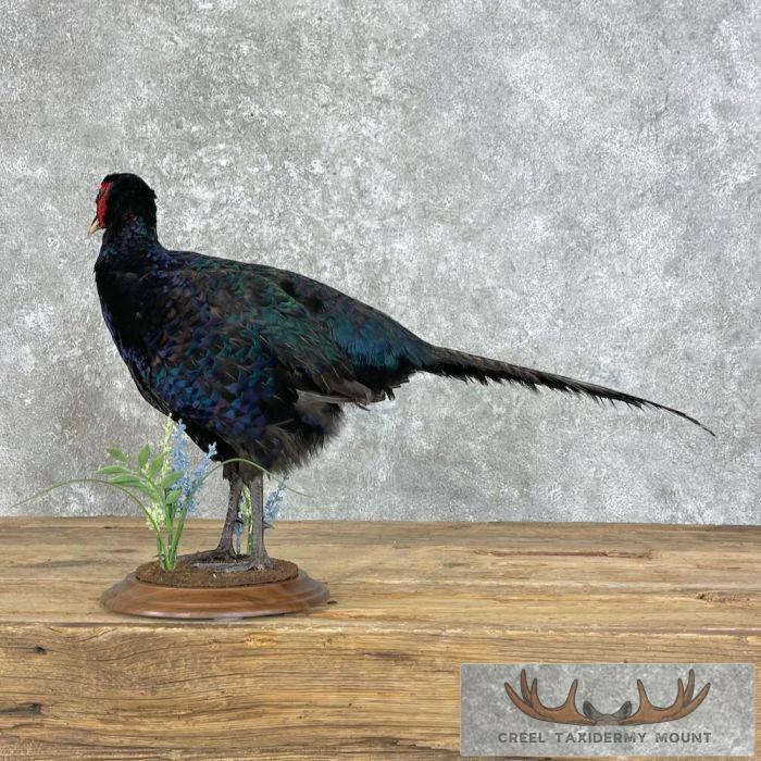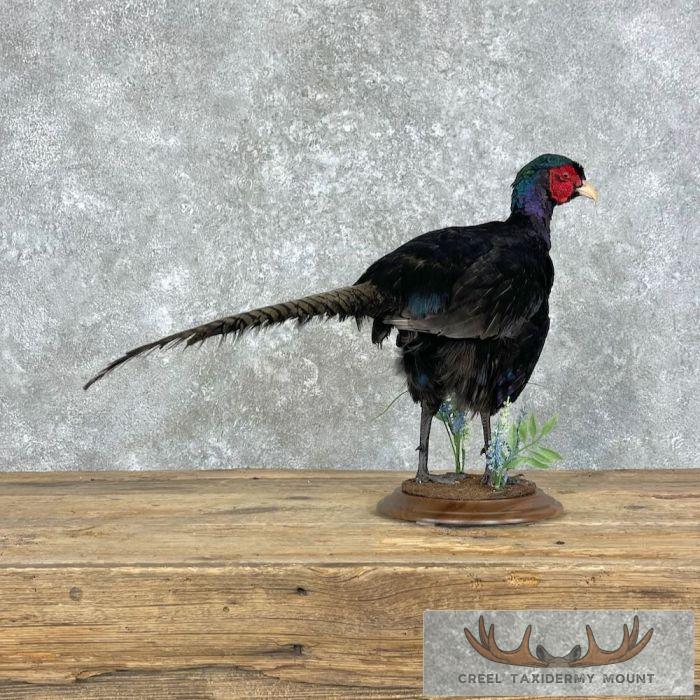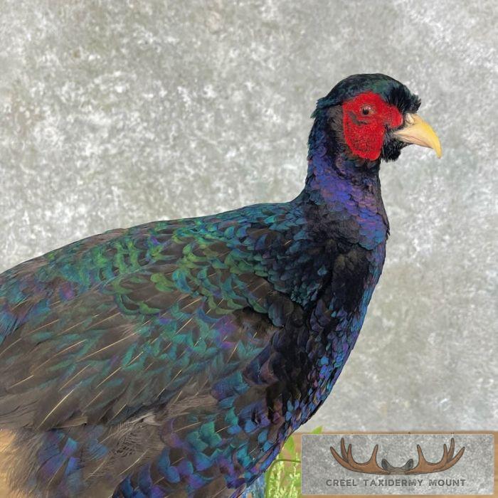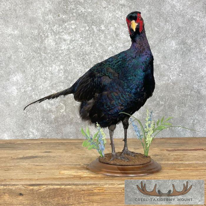 For sale, we have an amazing Green Pheasant taxidermy mount, posed standing on a custom habitat base. It features deep, rich coloration with fantastic overall feather quality, which combines with skillful taxidermy craftsmanship to earn this mount our Premier™ quality rating. All applicable dimensions are included to help ensure this item will fit within your intended display space.