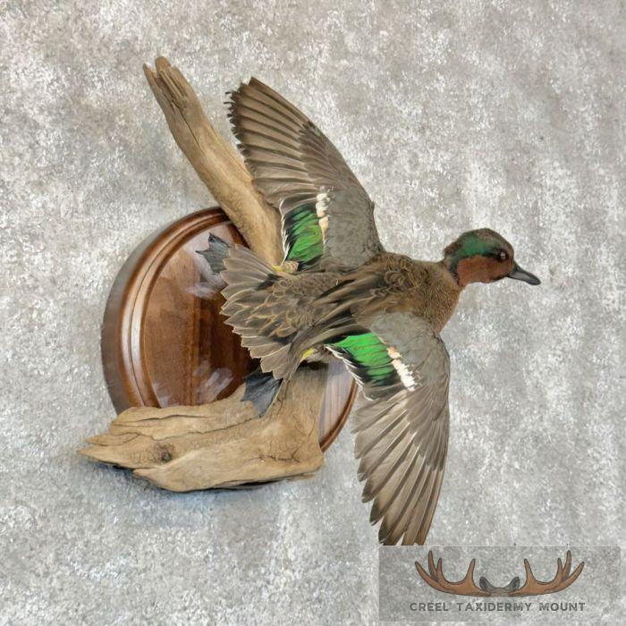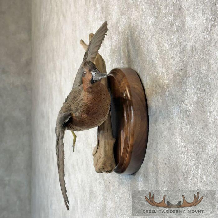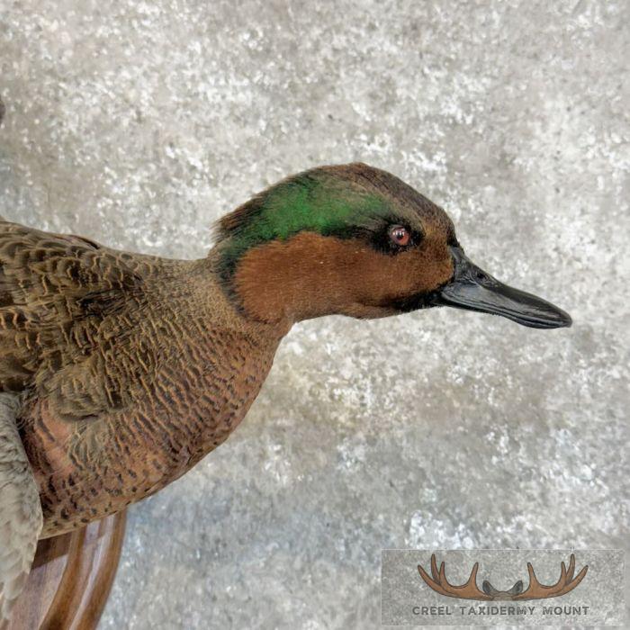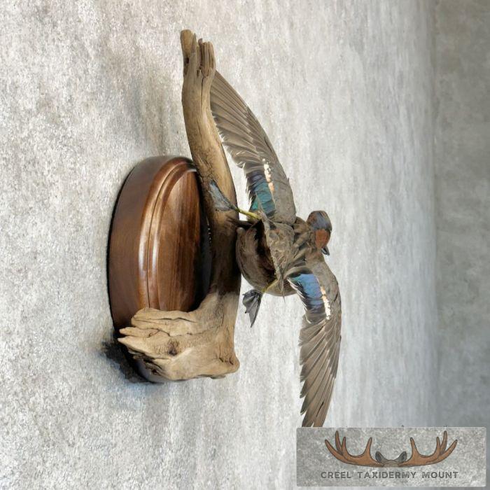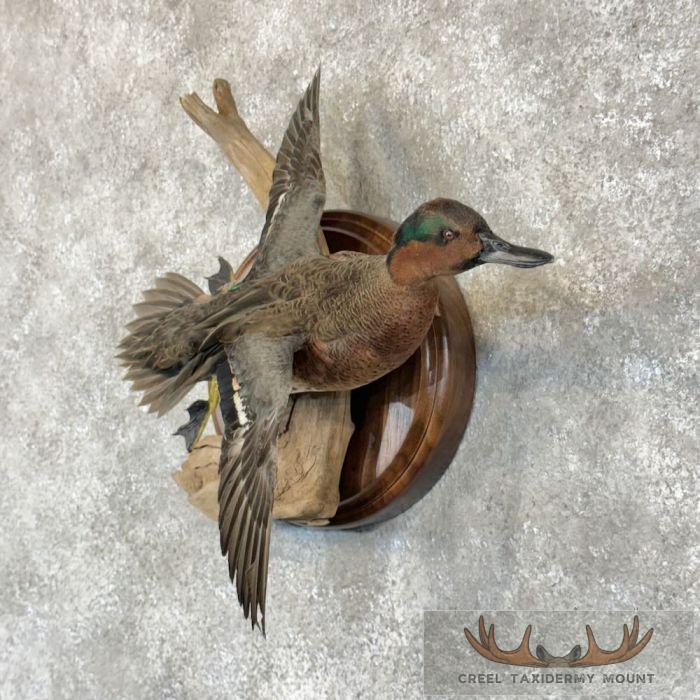 For sale, we have an exquisite Green-Winged x Cinnamon Teal cross taxidermy duck mount, posed flying to the viewer’s right side past a piece of driftwood affixed to a wood plaque. The feather color and quality on this duck are both in sensational condition. The craftsmanship is also flawless, earning this mount our coveted World Class™ overall quality rating. All applicable sizes and dimensions are included to make sure this item will fit within your intended display space.