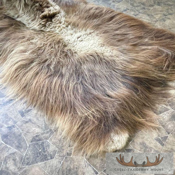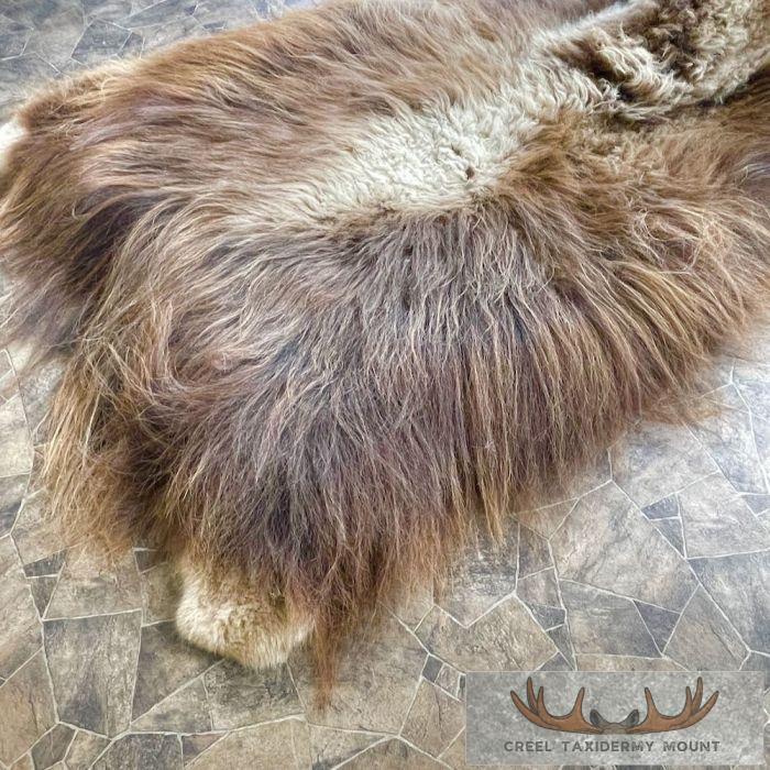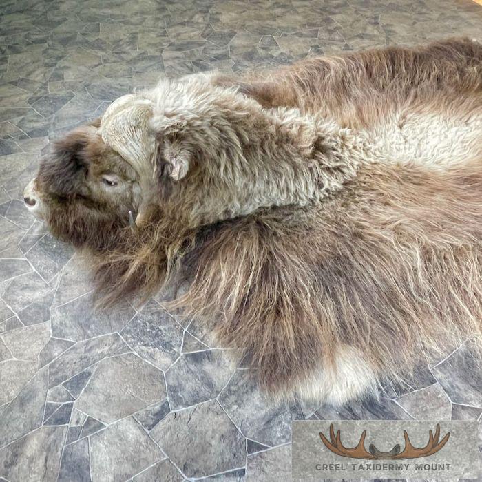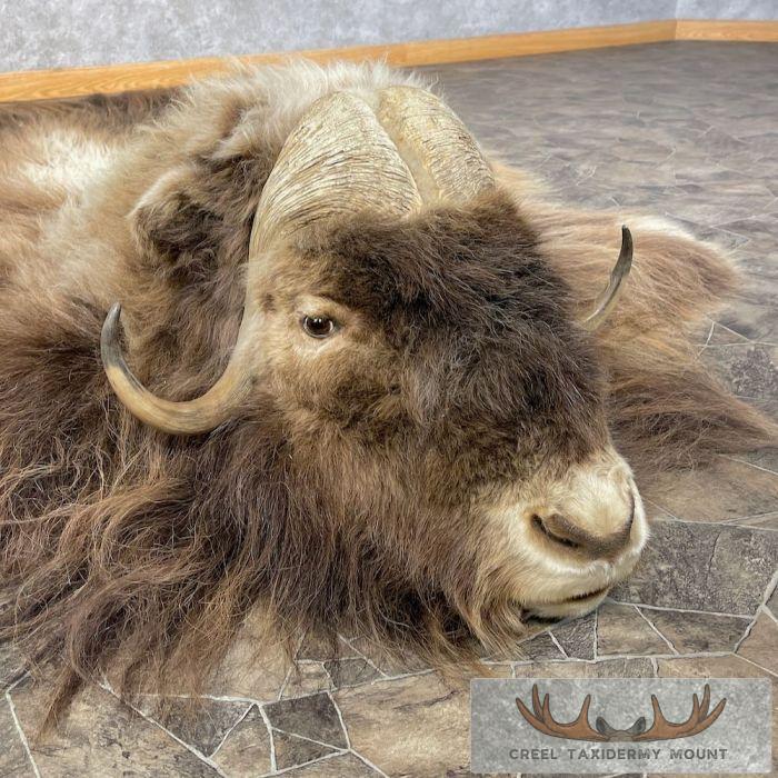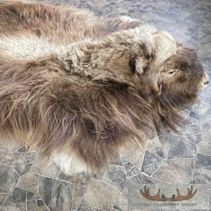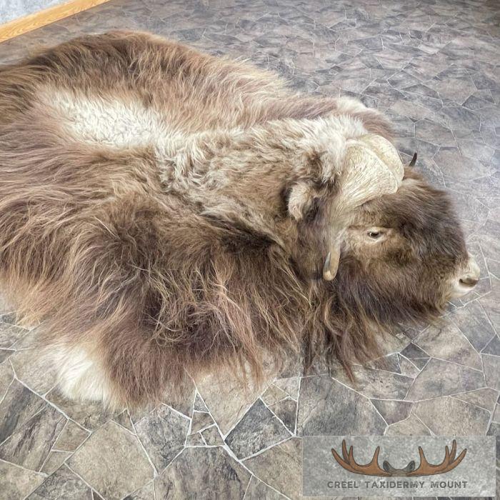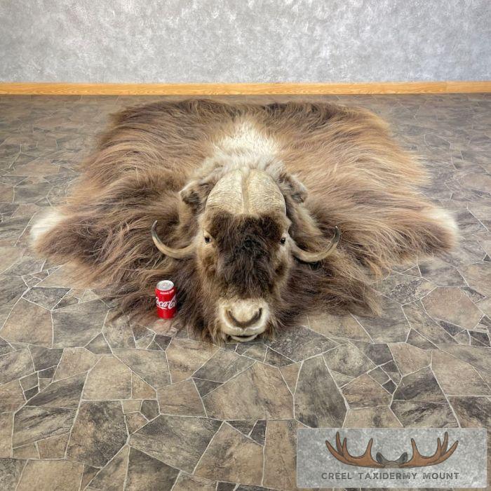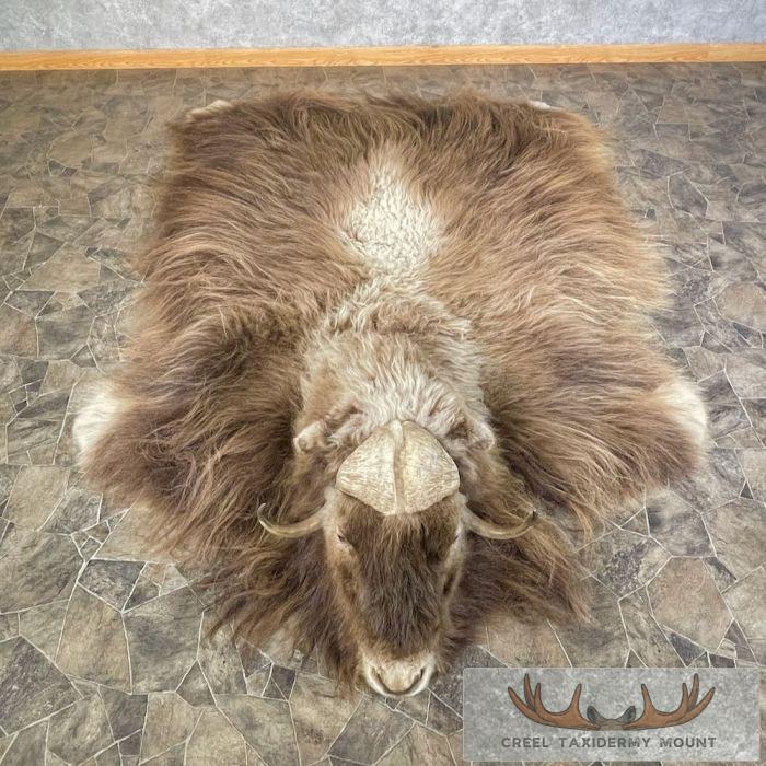 For sale, we have a phenomenal Greenland Muskox full-size taxidermy rug mount. This rug features a raised head, an outstanding set of horns, and a green felt backing, which provides durability and protection against wear. The horns on this beast are massive and really set this musk ox rug apart from others with a pair of horns that are over 24″ apiece. This Greenland Muskox rug is best displayed on the floor, but foot traffic is not recommended, as it will damage the hair. All applicable measurements and dimensions are provided in the specifications section to help ensure this item will fit within your intended space, as well as meet expectations regarding the item’s featured attribute sizes, scores, etc.