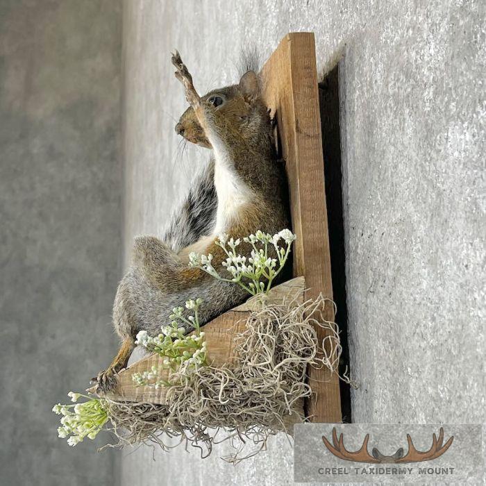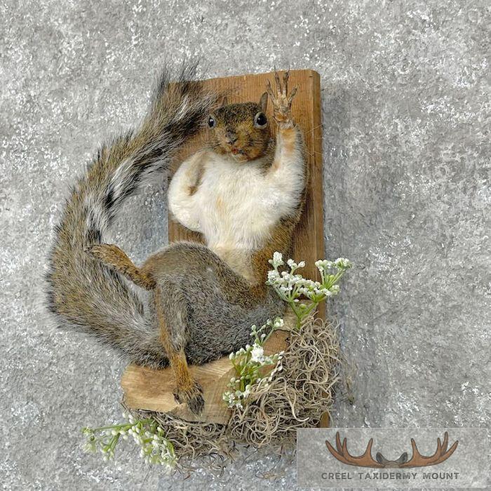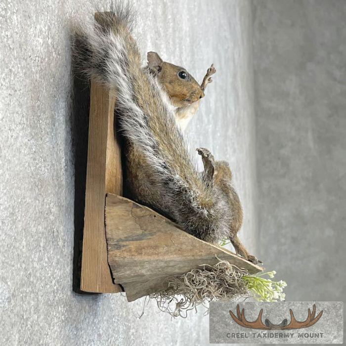 For sale, we have a fantastic Grey Squirrel taxidermy mount chilling out on a wooden wall habitat plaque. This squirrel features a lovely, soft fur coat, and skillful taxidermy quality, earning our Excellent™ overall quality rating. All applicable dimensions are included to help ensure this item will fit within your intended display space.
