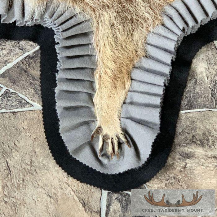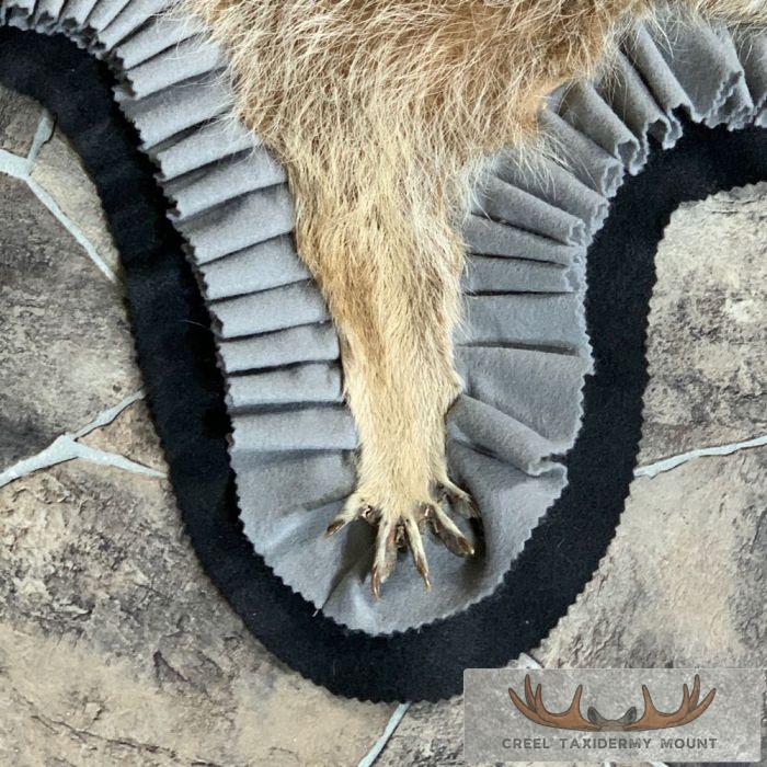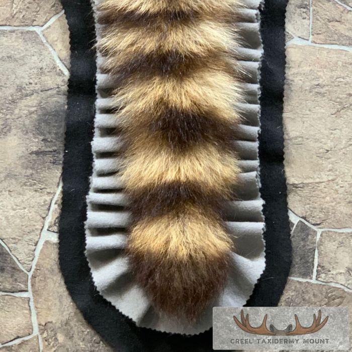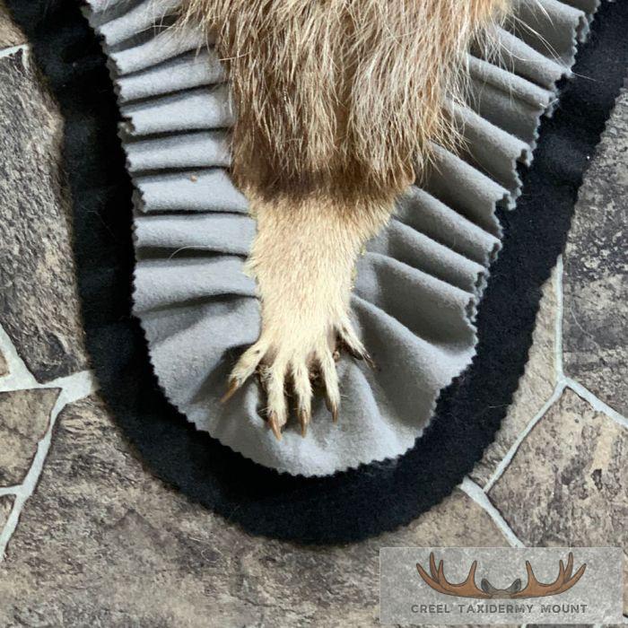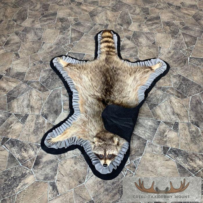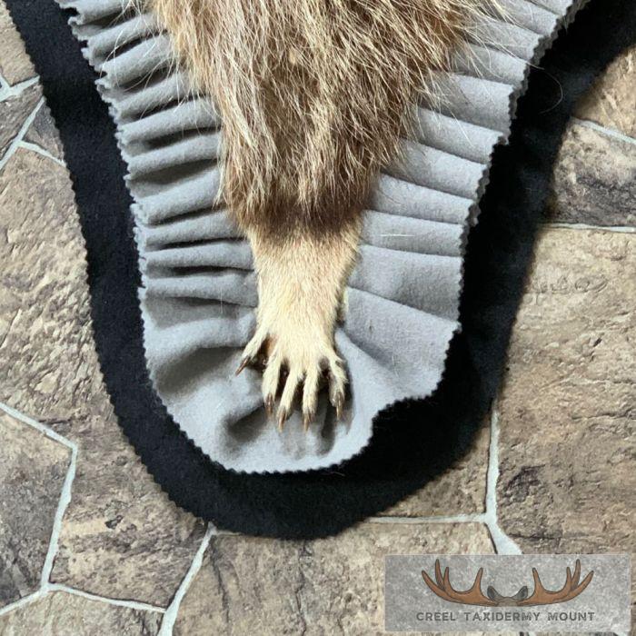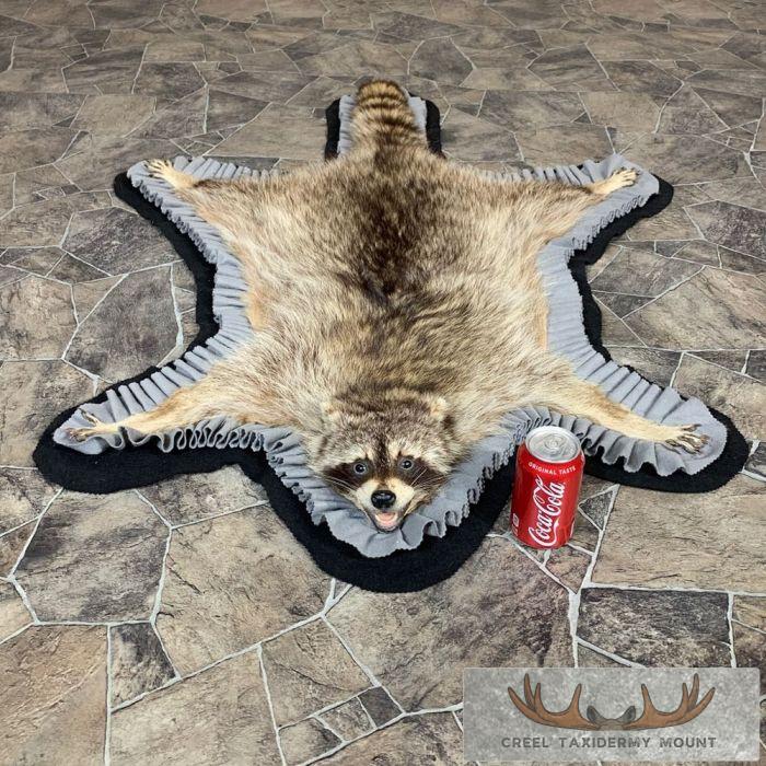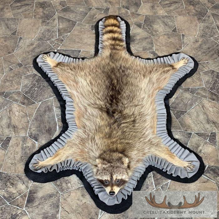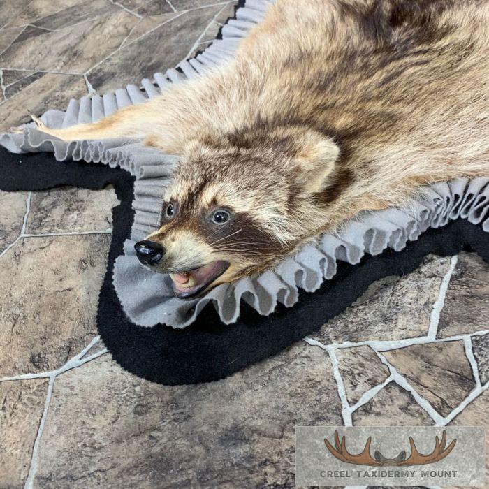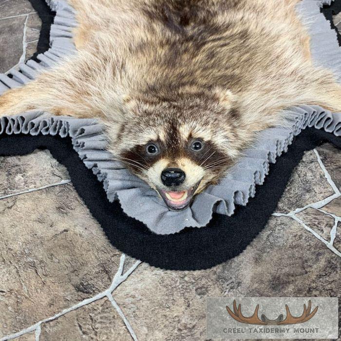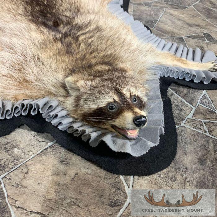 For sale, we have a phenomenal Raccoon full-size taxidermy rug. This rug has a full raised head with an open mouth and features a black felt backing, which provides durability and protection against wear. The hide and hair are in terrific shape, and the rug has been finished with a grey, and black felt accent trim. All these features combine to earn this item our Excellent Plus™ overall quality rating. All applicable dimensions are included to help ensure this item will fit within your intended display space.